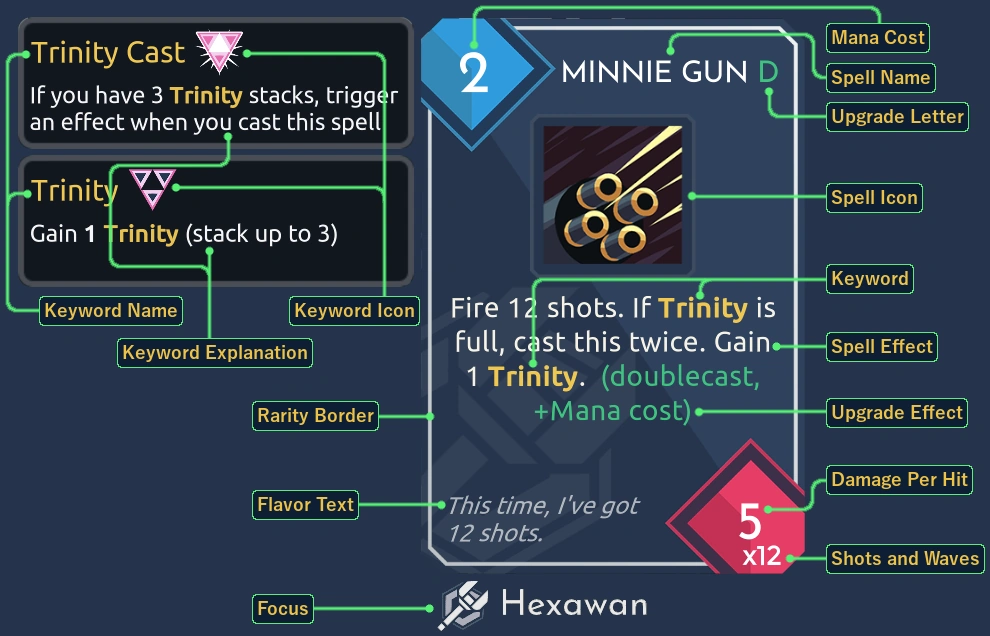 Gli incantesimi sono il tuo modo principale di interagire con i nemici (ovvero, per infliggere danni e distruggerli). Gli incantesimi vengono pescati casualmente dal tuo mazzo e rimessi in gioco ogni volta che mescoli , quindi One Step From Eden ti richiede di pensare rapidamente a come affrontare diverse minacce utilizzando le opzioni in continua evoluzione a portata di mano. Gli incantesimi possono essere potenziati per aggiungere effetti aggiuntivi